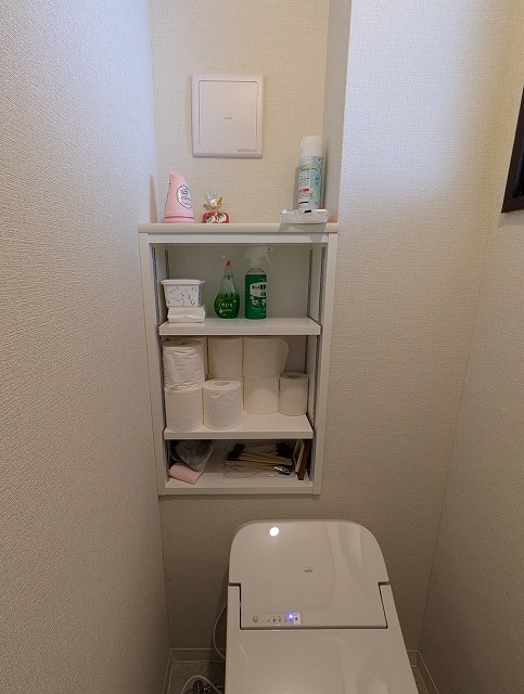 トイレ奥の収納は出来るだけ活かしたいとのことでした。トイレの手洗いは使わないと伺ったので、TOTOの一体型便器GGをご提案しました。背面の収納はオープン収納にして、可動棚を設置しました。用途を限定せずご利用いただけ、「想定より使いやすい」と感想をいただきました。