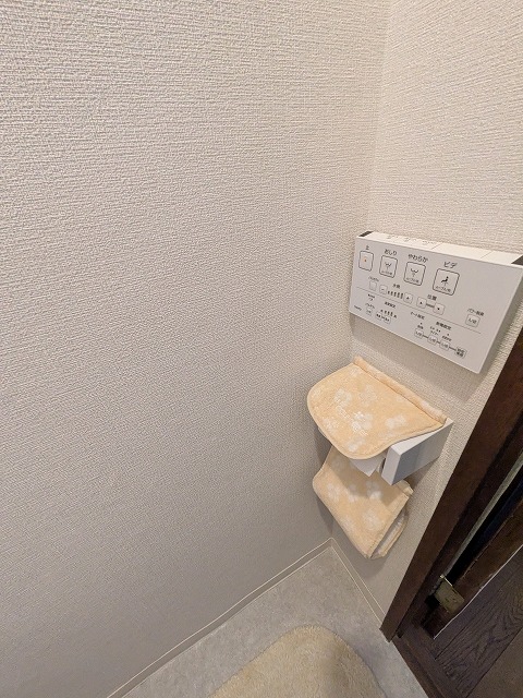 また今回便座のリモコンと紙巻器は正面の壁に取付け、将来便器横に手すりを付ける場合のスペースを確保しています。